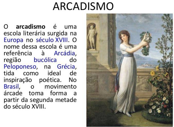 Também conhecido como Neoclassicismo ou Setecentismo, uma vez que representou um retorno aos clássicos ocorridos depois de meados de 1700. Seu nome se refere a Arcádia, região do sul da Grécia, em homenagem a Arcas, filho de Zeus e Calisto (uma bela jovem, que deu origem à constelação da Ursa Maior. Arcas, seu filho, tornou-se rei da Pelásguia, que passou a se chamar Arcádia em sua honra. Na Inglaterra e na França a burguesia passa a dominar a economia, mesmo porque, naquele período (1789) tem-se o início da Revolução Industrial, com a troca da manufatura (produtos feitos a mão) pelos produtos industrializados (feitos a máquina). Isso deixa sem prestígio o clero (a religião) e a monarquia (o rei) e abre caminho para a classe burguesa, valorizando o homem, por isso, antropocentrismo. Claro, a força operária era importante fator para o crescimento da economia. O Arcadismo busca valorizar a vida no campo; o bucolismo e despreza a vida urbana, dando ênfase à mulher amada, ao pastoralismo, com linguagem simples e o uso de pseudônimos, com o intuito de aproveitar o momento (carpe diem), num lugar mais ameno (locua amoenus), fugindo das cidades (fugere urbem) e cortando tudo que era inútil (inutilia truncat). Enfim, o Arcadismo foi o retorno ao convencionalismo amoroso, onde no Brasil era o auge do ciclo de ouro em Minas Gerais, em Vila Rica, atual Ouro Preto, quando vai ocorrer a Inconfidência Mineira (1792) pelos levantes dos Inconfidentes que tem à frente: Joaquim José da Silva Xavier (Tiradentes), tendo como principais poetas: Santa Rita Durão (1722-1784, autor do poema: Caramuru; Cláudio Manuel da Costa (1729-1789); Basílio da Gama (1741-1795), autor de O Uruguai; Tomás Antônio Gonzaga (1744-1810), autor de Marília de Dirceu e Cartas Chilenas; Inácio José de Alvarenga Peixoto (1744-1793); Silva Alvarenga (1749-1793) e Bocage (1785-1805).